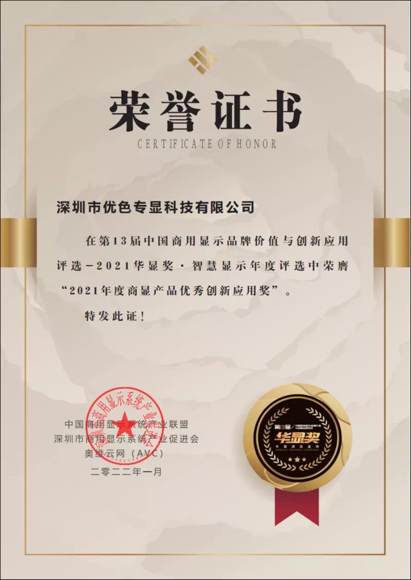 熱烈祝賀優(yōu)色專(zhuān)顯榮獲“2021年度商顯產(chǎn)品優(yōu)秀創(chuàng)新應(yīng)用獎(jiǎng)”-華顯獎(jiǎng)
