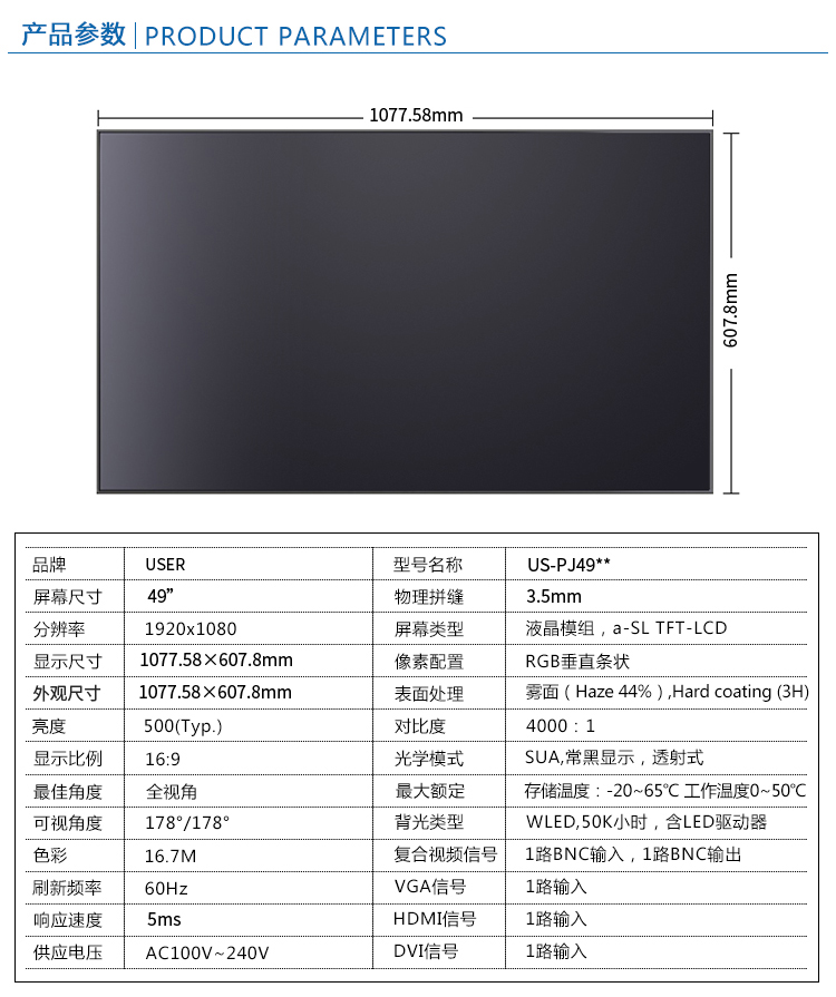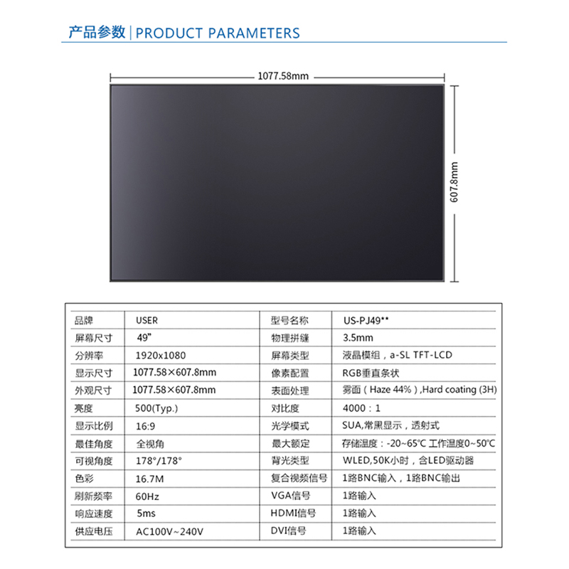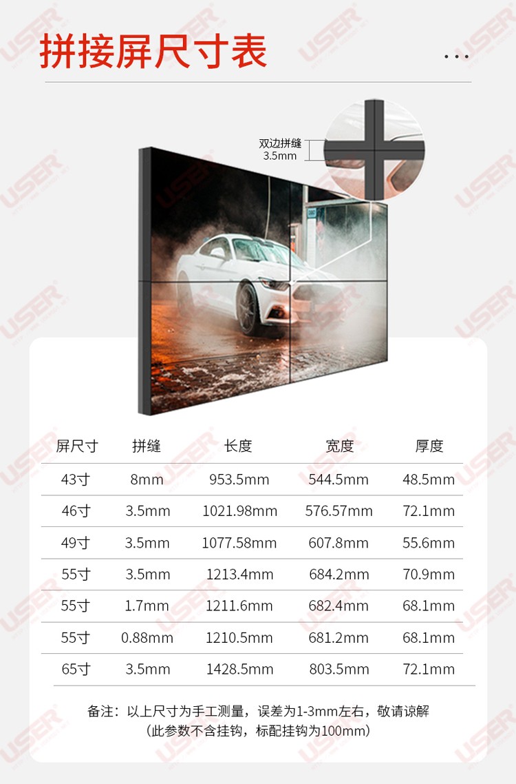 菜單產(chǎn)品中心Product center 液晶廣告機(jī) 壁掛式廣告機(jī) 落地立式廣告機(jī) 電梯超薄廣告機(jī) 車載廣告機(jī) 高亮廣告機(jī) 戶外廣告機(jī) 液晶拼接屏 專業(yè)液晶拼接屏 4K液晶拼接屏 廣告拼接屏 無縫液晶拼接屏 觸摸液晶拼接屏 LED顯示屏 觸控一體機(jī) 壁掛式觸控一體機(jī) 立式觸控一體機(jī) 斜面觸控一體機(jī) 智能家居觸控一體機(jī) 戶外觸控一體機(jī) 液晶電子白板 教育電子白板 會議電子白板 工控一體機(jī) 觸摸顯示器 紅外觸摸顯示器 電容觸摸顯示器 電阻觸摸顯示器 聲波觸摸顯示器 納米觸摸顯示器 液晶監(jiān)視器 專業(yè)級監(jiān)視器 4K監(jiān)視器 嵌入式監(jiān)視器 機(jī)架式監(jiān)視器 開放式監(jiān)視器 SDI監(jiān)視器 高亮監(jiān)視器 廣播級監(jiān)視器 工業(yè)顯示器 4K顯示器 機(jī)架式顯示器 開放式顯示器 醫(yī)療顯示器 KVM顯示器 指揮室顯示器 智慧校園產(chǎn)品 專業(yè)定制商顯 多屏廣告機(jī) 多功能觸控一體機(jī) 多功能廣告機(jī) 微信打印廣告機(jī) 魔鏡廣告機(jī) 透明廣告機(jī) 全息廣告機(jī) 條形屏廣告機(jī) 旋轉(zhuǎn)廣告機(jī) 裸眼3D廣告機(jī) 人工智能產(chǎn)品 顯示配套設(shè)備 拼接配套設(shè)備 廣告機(jī)播放盒 OPS播放盒 拼接支架 移動(dòng)支架 相關(guān)軟件 吊頂支架 線材 木架 蜂窩箱 桌面底座 熱門產(chǎn)品 →優(yōu)色3.5mm超窄邊46寸液晶拼接屏→優(yōu)色49寸3.5mm超窄邊液晶拼接屏→優(yōu)色3.5mm超窄邊55寸液晶拼接屏 您的位置:首頁 → 公司產(chǎn)品 → 液晶拼接屏 → 專業(yè)液晶拼接屏 優(yōu)色49寸3.5mm超窄邊液晶拼接屏類別:專業(yè)液晶拼接屏 簡介:◆ 型號:US-PJ49** ◆類型:三星/LG/京東方BOE面板 ◆亮度:500-700cd/m2(可選) ◆超窄邊設(shè)計(jì),拼縫3.5mm ◆ 在ISO9001嚴(yán)格的質(zhì)量控制體系下生產(chǎn)? ◆ 色彩均勻,圖像穩(wěn)定,為拼接大畫面定制... 在線咨詢 返回列表 產(chǎn)品說明 相關(guān)產(chǎn)品 優(yōu)色1.7mm超窄邊55寸液晶拼接屏 優(yōu)色49寸1.8mm超窄邊液晶拼接墻 優(yōu)色49寸3.5mm超窄邊液晶拼接屏 優(yōu)色3.5mm超窄邊55寸液晶拼接屏 優(yōu)色3.5mm超窄邊46寸液晶拼接屏 優(yōu)色5.3mm超窄邊55寸液晶拼接屏