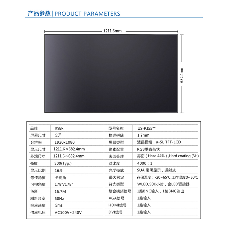 菜單產(chǎn)品中心Product center 液晶廣告機(jī) 壁掛式廣告機(jī) 落地立式廣告機(jī) 電梯超薄廣告機(jī) 車(chē)載廣告機(jī) 高亮廣告機(jī) 戶外廣告機(jī) 液晶拼接屏 專業(yè)液晶拼接屏 4K液晶拼接屏 廣告拼接屏 無(wú)縫液晶拼接屏 觸摸液晶拼接屏 LED顯示屏 觸控一體機(jī) 壁掛式觸控一體機(jī) 立式觸控一體機(jī) 斜面觸控一體機(jī) 智能家居觸控一體機(jī) 戶外觸控一體機(jī) 液晶電子白板 教育電子白板 會(huì)議電子白板 工控一體機(jī) 觸摸顯示器 紅外觸摸顯示器 電容觸摸顯示器 電阻觸摸顯示器 聲波觸摸顯示器 納米觸摸顯示器 液晶監(jiān)視器 專業(yè)級(jí)監(jiān)視器 4K監(jiān)視器 嵌入式監(jiān)視器 機(jī)架式監(jiān)視器 開(kāi)放式監(jiān)視器 SDI監(jiān)視器 高亮監(jiān)視器 廣播級(jí)監(jiān)視器 工業(yè)顯示器 4K顯示器 機(jī)架式顯示器 開(kāi)放式顯示器 醫(yī)療顯示器 KVM顯示器 指揮室顯示器 智慧校園產(chǎn)品 專業(yè)定制商顯 多屏廣告機(jī) 多功能觸控一體機(jī) 多功能廣告機(jī) 微信打印廣告機(jī) 魔鏡廣告機(jī) 透明廣告機(jī) 全息廣告機(jī) 條形屏廣告機(jī) 旋轉(zhuǎn)廣告機(jī) 裸眼3D廣告機(jī) 人工智能產(chǎn)品 顯示配套設(shè)備 拼接配套設(shè)備 廣告機(jī)播放盒 OPS播放盒 拼接支架 移動(dòng)支架 相關(guān)軟件 吊頂支架 線材 木架 蜂窩箱 桌面底座 熱門(mén)產(chǎn)品 →優(yōu)色3.5mm超窄邊46寸液晶拼接屏→優(yōu)色49寸3.5mm超窄邊液晶拼接屏→優(yōu)色3.5mm超窄邊55寸液晶拼接屏 您的位置:首頁(yè) → 公司產(chǎn)品 → 液晶拼接屏 → 專業(yè)液晶拼接屏 優(yōu)色1.7mm超窄邊55寸液晶拼接屏類別:專業(yè)液晶拼接屏 簡(jiǎn)介:◆ 型號(hào):US-PJ55** ◆類型:三星/LG/京東方BOE面板 ◆亮度:500-700cd/m2(可選) ◆超窄邊設(shè)計(jì),拼縫1.7mm ◆ 在ISO9001嚴(yán)格的質(zhì)量控制體系下生產(chǎn)? ◆ 色彩均勻,圖像穩(wěn)定,為拼接大畫(huà)面定制... 在線咨詢 返回列表 產(chǎn)品說(shuō)明 相關(guān)產(chǎn)品 優(yōu)色1.7mm超窄邊55寸液晶拼接屏 優(yōu)色49寸1.8mm超窄邊液晶拼接墻 優(yōu)色49寸3.5mm超窄邊液晶拼接屏 優(yōu)色3.5mm超窄邊55寸液晶拼接屏 優(yōu)色3.5mm超窄邊46寸液晶拼接屏 優(yōu)色5.3mm超窄邊55寸液晶拼接屏