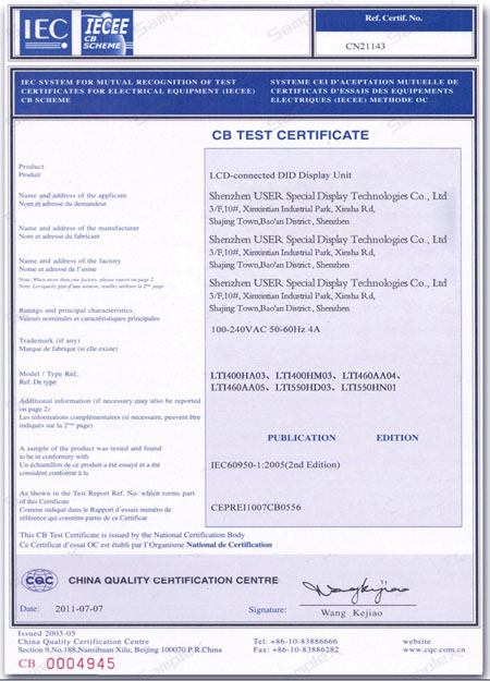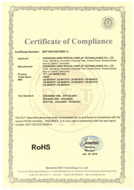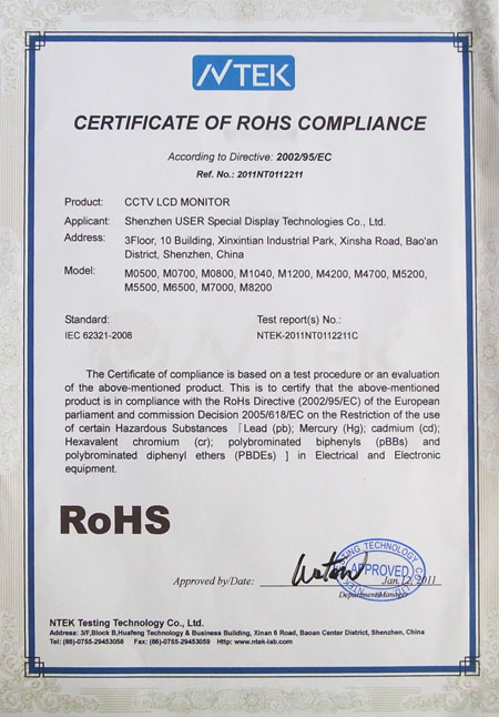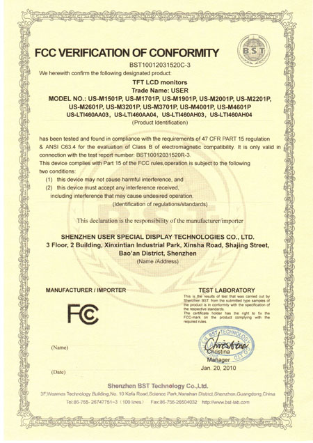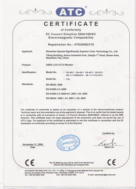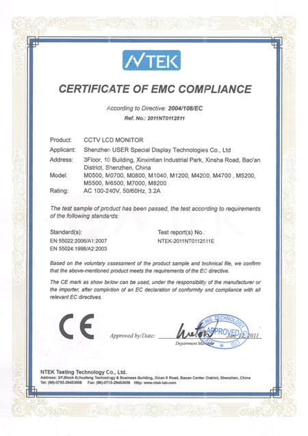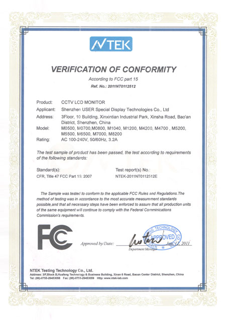 FCC認證歐盟認證(液晶監視器合格證明證書)